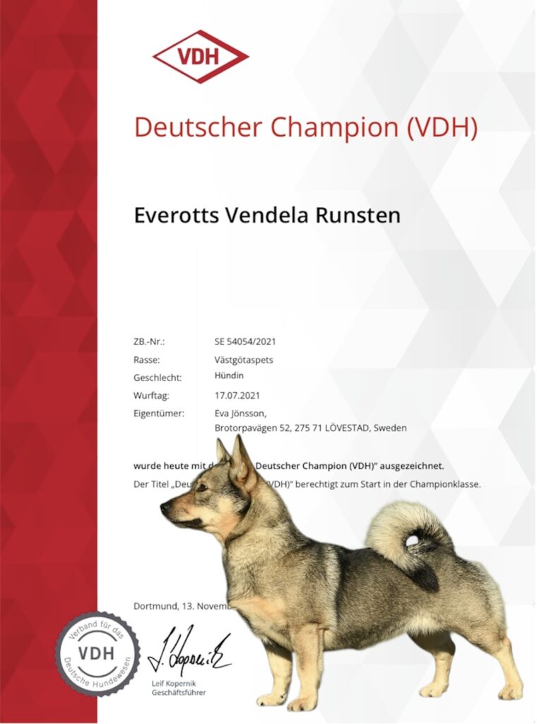 Everotts Winston Runsten BIR, Everotts Vendela Runsten BIM med CACIB, Köpenhamnvinnare -23 på Roskilde IDS 23.09.23, Domare Tomas Rohlin. Vendela vann även CACIB 24.09,24 för Jussi Liimatainen.Sitt första CACIB vann Vendela i Fredericia 23-02-12 endast 18 mån gammal! Domare Helle Røschke DK.Vendleas 2:a CACIB från Tvååker 23-07-07. Domare Maarit Hassinen FI.Vendelas 3:e CACIB Roskilde 23-09-23. Domare: Tomas Rohlin DK.Vendelas 4:e CACIB Roskilde 23-09-24. Domare. Jussi Liimatainen FIVendelas 5:e CACIB Prag 231209 (BIR) Domare Perttu Stålberg, FIVendelas 6:e CACIB Prag 231210 (BIR) Domare Gabriela Richard-Steinbach DEVendelas 7:e CACIB Hazerswoude 24-04-14 BIM och Rinjland Grand Star-24. Domare Erna Upmeijer NL därmed C.I.B!
